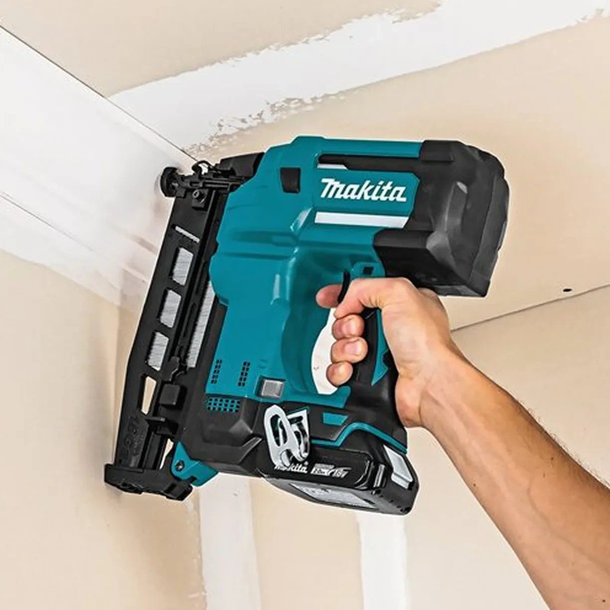 - ایمنی و راحتی در کار: ماکیتا با طراحی ارگونومیک و دسته نرم، استفاده از این میخکوب را برای ساعتهای طولانی راحت کرده است. وزن مناسب دستگاه (۳.۸ کیلوگرم با باتری) و طراحی متوازن آن، خستگی دست را به حداقل میرساند. علاوه بر این، چراغ LED تعبیهشده روی دستگاه، به شما کمک میکند تا در محیطهای کمنور نیز دید کافی داشته باشید و با دقت کار کنید.